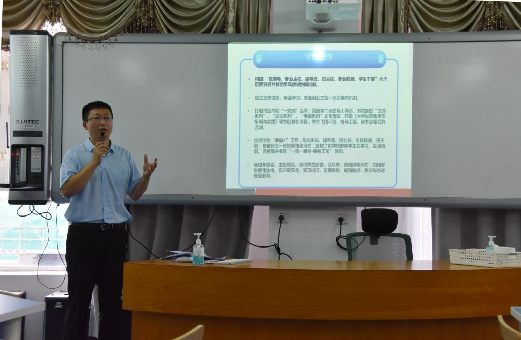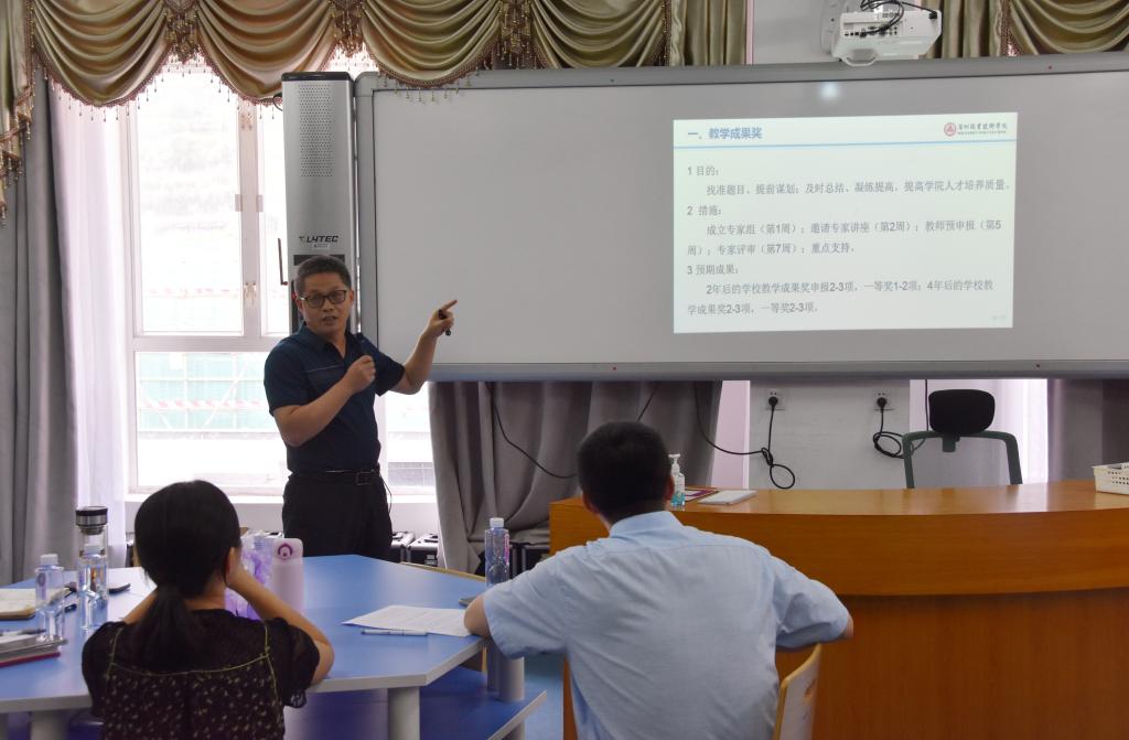 黄略略从专业设置、专业更名与专业新增、职教本科专业申报、课程建设等方面部署了教学工作安排。黄略略说,学院将着眼于未来学院长远发展需要,优化专业设置,合力推进职教本科专业申报,希望全体专任教师按照学院“金课”建设“十个一”的标准全力推进金课建设,并就教学团队组建、教学能力大赛、学生技能大赛等工作进行部署,确保岗、赛、课、证深度融通。