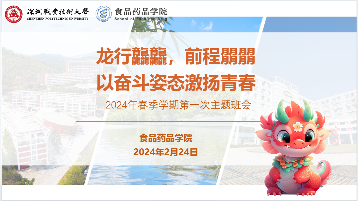 为进一步加强大学生思想政治教育工作,引导广大学生以昂扬向上的精神风貌为新一年学习生活开好局起好步,2月24-27日,食药学院各年级陆续开展“龙行龘龘,前程朤朤,以奋斗姿态激扬青春”主题班会,校工会副主席陈彩勤、刘耀光、学院领导、全体班主任、辅导员参会。