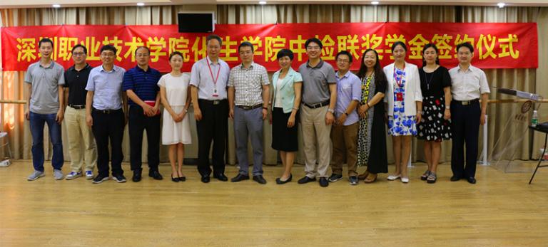 刘怡、肖玲、林峰在与会领导的见证下,共同签署了深圳职业技术学院化生学院中检联奖学金捐赠协议书,毕建秋接受了刘怡向基金会捐赠的中检联奖学金支票。据协议,中检联公司将分3期共捐赠我校15万元,用于奖励化生学院检测类相关专业品学兼优的学生。