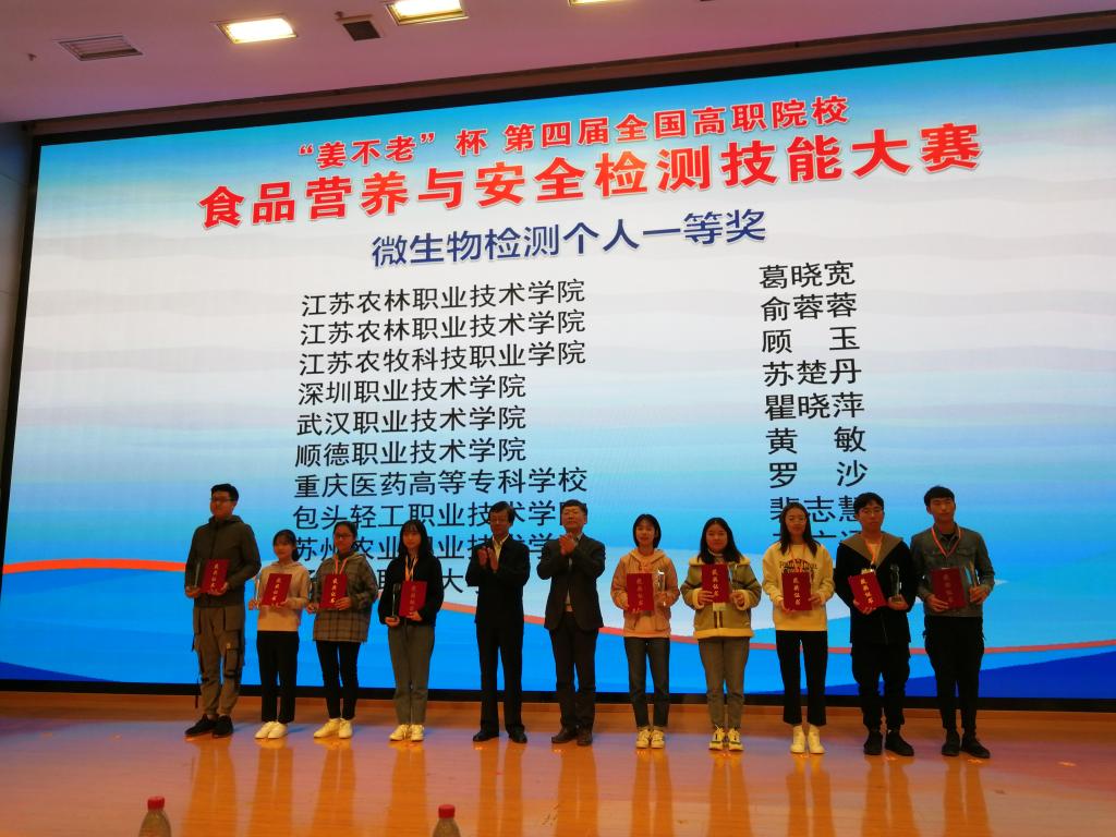 11月15-17日,由全国食品工业职业教育教学指导委员会主办的“姜不老杯”第四届全国高职院校“食品营养与安全检测”技能大赛在江苏农林职业技术学院举行,来自全国相关行业领域的84所职业技术院校164名选手参加本次大赛。我校化生学院食品专业群主任黄略略带队参赛。经过激烈的角逐,我校沈丽老师指导的学生苏楚丹获微生物检测赛项一等奖,李彬老师指导的学生许斯敏获营养素检测赛项二等奖,我校参赛团队荣获团体一等奖。
